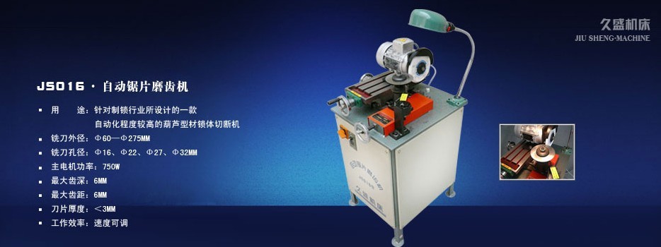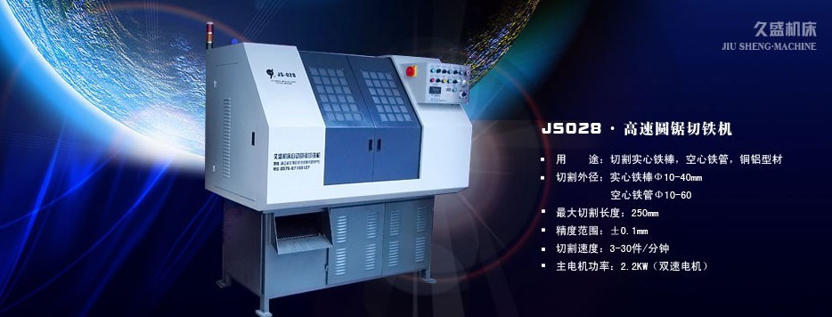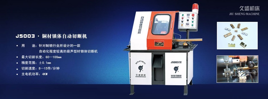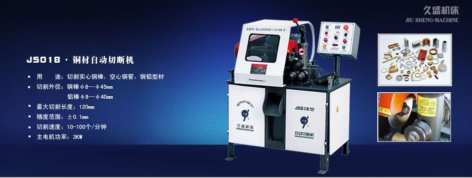 在这12年里,我们久盛人团结创新,不断设计开发了JS系列自动铁棒圆锯机,自动铜棒切断机、自动锁体切断机、锯片磨齿机。本机适合水暖、阀门、锻造、零件精加工行业作材料批量下料所用,是有色金属型材、棒料、管子的专用切断机床。该机采用常规的电气原件与机械零件组成,具有结构简单、安全可靠、性能稳定、维护方便、价格低廉、可一人多机操作等特点,材料切断的全过程,自动进料、定长、切断、报警、计数、工件与切屑分离。可切断圆形、六角、三角、方形、扁形管子等,较大幅度减轻工人劳动强度,提高生产效率,因此深受国内外客户的欢迎。