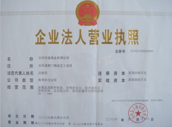玉环幸福泵业有限公司的前身为“剑峰泵业有限公司”,是一家有着15年以上家用及农用水泵生产经验的专业水泵制造厂家。