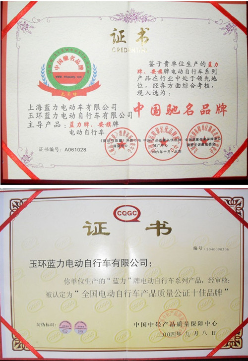 多年以来,其"蓝力"商标已经获国家工商局注册。"蓝力"牌电动自行车已在浙江省公安厅交警总队批准上目录,生产质量保证体系已通过国家技术监督局验收并取得全国生产许可证,同时产品经国家轻工业电动自行车质量监督检测合格。其中"蓝力"牌电动自行车被中国中轻产品质量保障中心认定为"全国电动自行车产品质量公证十佳品牌"。