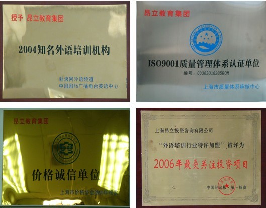 2001年,昂立教育在全国外语培训学校中率先通过ISO9001的国际质量认证体系,开创培训界先河;2003年,昂立教育被“新浪网”评为全国十大知名外语培训机构;2004年,昂立教育以总分第一名被评为“上海十佳外语培训机构”;2005年,在由搜狐等全国多家知名媒体单位组织的“2005度中国教育总评榜”评选中,昂立教育集团更是一举荣获 “中国十大品牌教育集团”、“中国优秀青少儿培训机构”、“2005年度综合实力知名外语培训机构”、“中国优秀商务英语培训机构”等多项殊荣;2006年,昂立再次获得“中国十大品牌教育集团”的殊荣。