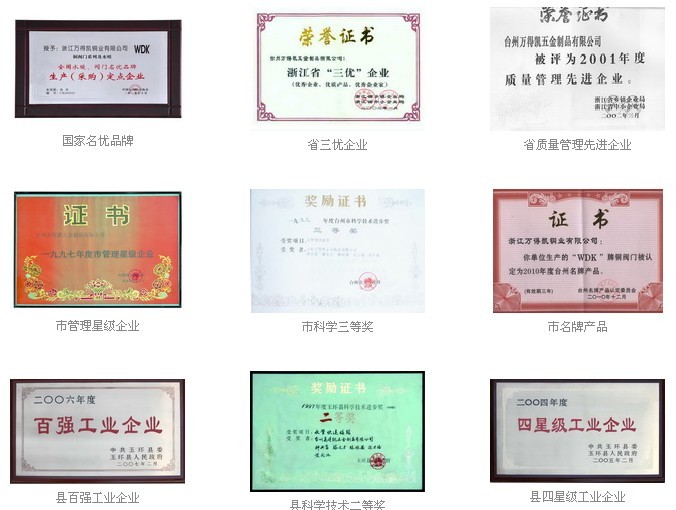 公司是国家水暖(阀门)名优品牌生产(采购)定点企业;省“质量管理先进企业”、“三优”企业;市“规模效益企业”、“名牌产品企业”;县“百强企业”、“纳税先进企业”。所设计与开发的水管快速接头曾获省新产品认定,市科学技术进步三等奖、县科学技术进步二等奖。