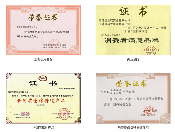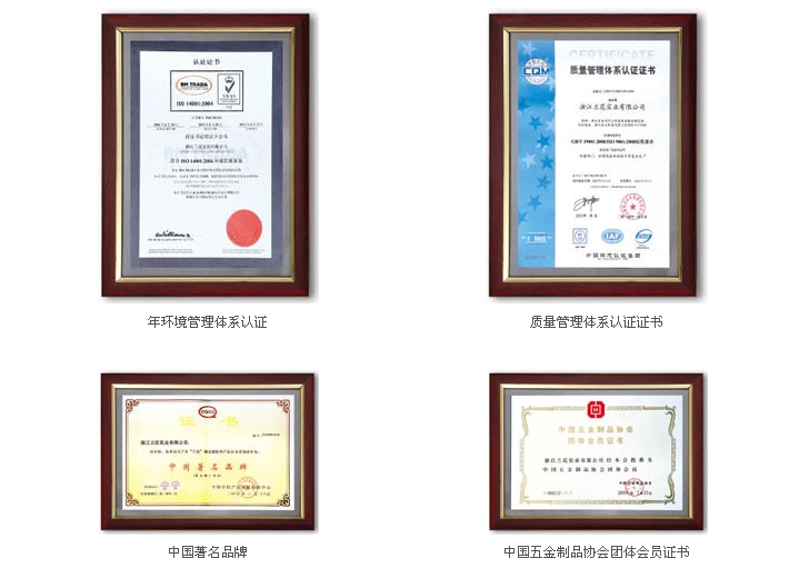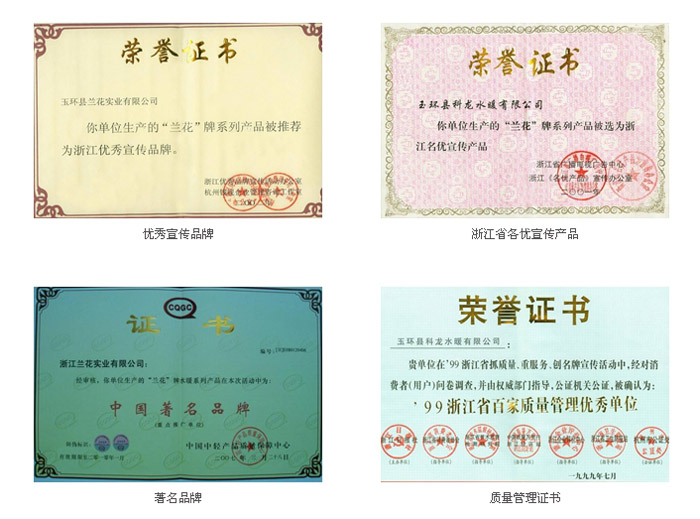 1999年获得“浙江省地方推荐产品”、“浙江省百家质量管理优秀企业”;被中国消费者协会评为“2000年消费者满意品牌”;2003年“消费者协会信得过质量、服务诚信企业”,2001年省政府颁发的“浙江省名优产品”;2002年中国质量万里行工作指导委员会颁发“产品质量信用单位”等荣誉称号,公司通过了ISO9001:2000国际质量标准化体系认证,及韩国KS国家标准认证等,获得《中华人民共和国进出口企业资格证书》。