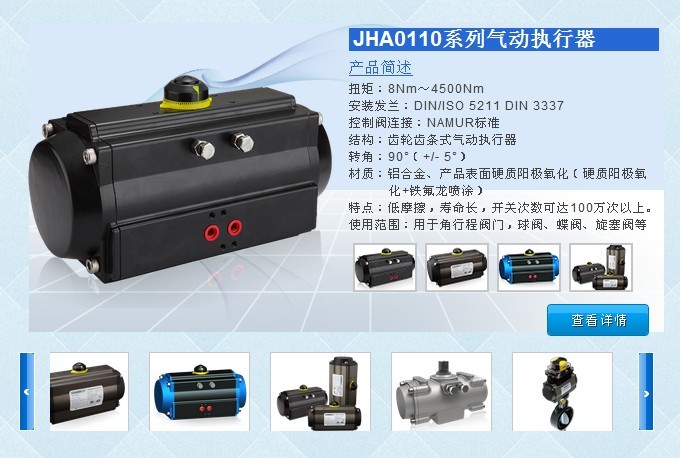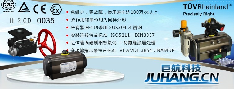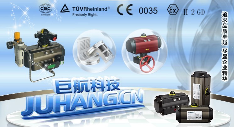 台州巨航自动化设备科技有限公司坐落于浙江省东海岸边的美丽小岛——玉环,公司占地面积6500平方米,是一家专业从事阀门气动执行器、阀门手动执行器(蜗轮箱、伞齿轮箱)等各类自动化控制阀门的研发、生产制造、检验、营销于一体的高新技术企业,年产10万台执行器。